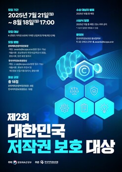 문화체육관광부(문체부)는 한국저작권보호원(저작권보호원)과 함께 21일~8월 18일 '제2회 대한민국 저작권 보호 대상' 후보자에 대한 대국민 추천을 받는다.케이팝, 영화, 드라마, 웹툰 등 'K(케이)-콘텐츠'의 위상은 전 세계적으로 높아지고 있으며, 반면 콘텐츠 불법