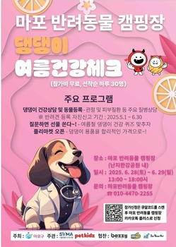 마포구(청장 박강수)는 서울시수의사회와 함께 28일(토)부터 29일(일)까지 양일 간 난지한강공원 내 ‘마포반려동물캠핑장’에서 반려가족들을 위한 ‘댕댕이 여름철 무료건강상담’ 행사를 개최한다고 밝혔다.동물등록 자진신고 기간 홍보를 위해 마련된 이번 행사는 지난 4월 ‘