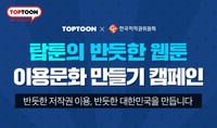 탑코믹스에서 운영하고 있는 웹툰 전문 플랫폼 '탑툰'이 한국저작권위원회(이하 한저위)와 '반듯한 웹툰 이용문화 만들기 캠페인'을 실시한다. 10월 24일부터 3주간 진행되는 이번 캠페인은 탑툰을 이용하는 회원을 대상으로 웹툰에 대한 저작권 인식 개선과 반듯한 저작권 이