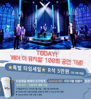 '베어 더 뮤지컬'이 '100회 공연 기념 타임세일' 이벤트를 진행한다.지난해 6월 17일 한국 초연한 '베어 더 뮤지컬'은 7월 14일 8시 공연을 기준으로 100회를 맞는다. 이번 이벤트는 100회 공연일인 7월 14일 오전 10시부터 자정까지 단 하루 동안만 인터