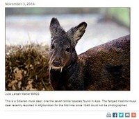 '뱀파이어 노루'라 불리는 카슈미르 사향 노루(Kashmir Musk Deer)가 발견됐다. 3일(현지시간) 미국 과학전문매체 라이브 사이언스닷컴은 국제야생동물보존협회 아시아지부(Wildlife Conservation Society's Asia) 연구진이 아프가니스탄