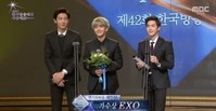 그룹 엑소가 ‘한국방송대상’에서 연기자 부문 개인상 가수상을 수상했다. 3일 방송된 MBC ‘한국방송대상 시상식’ 42회는 MBC 상암 공개홀에서 진행됐다.이날 시상식에서는 가수상을 수상한 엑소(EXO)의 멤버 수호, 찬열, 백현이 참석해 자리를 빛냈다.가수상을 수상한