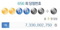 2015년 6월 27일 실시된 제656회 나눔로또 1등 당첨번호는 '3, 7, 14, 16, 31, 40'이며, 2등 보너스 번호는 39번이다. 이번 로또 당첨번호 추첨결과 1등 당첨자는 2명이었으며 당첨금액은 약 73억이다. 당첨번호 5개와 보너스 번호를 맞