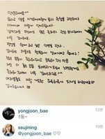 방송인 박수진의 손 편지에 배용준이 댓글을 달아 누리꾼들의 눈길을 끌고 있다.박수진은 지난 20일 자신의 인스타그램에 팬들에게 손 편지를 쓴 사진을 한 장 게재했다.공개된 사진에서는 박수진이 직접 쓴 글씨로 “한참을 고민하다 이렇게 인사드린다. 갑작스러운 소식에도 많은