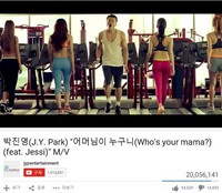 박진영의 ‘어머님이 누구니’가 뮤직비디오 조회수 2천만뷰를 돌파했다. 박진영의 ‘어머님이 누구니’뮤직비디오는 지난 4월 유튜브를 통해 공개해 화제를 모은 바 있다.이는 섹시하고 아름다운 여성에 대한 몸매를 담은 가사로 헬스장에서 본 여성 허리가 24인치, 힙이 34인