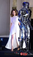 영화 '터미네이터 제니시스'의 주연 아놀드 슈왈제네거와 에밀리아 클라크 내한 기자회견이 2일 오전 서울 강남구 리츠칼튼서울 그랜드볼룸에서 열렸다.이날 기자회견에 참석한 에밀리아 클라크가 터미테이너 모형을 지나쳐 단상에 오르고 있다.한편 에밀리아 클라크는 미국드라마 ‘왕