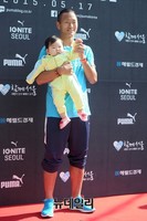 17일 서울시 마포구 홍대 삼거리에서 2015 푸마 이그나이트(IGNITE) 서울 레이스 대회가 열렸다이날 '이그나이트 서울'레이스에 참가한 축구선수 정대세가 아이와 함께 포즈를 취하고 있다.글로벌 스포츠 패션브랜드 푸마(PUMA)는 홍대에서 여의도까지 10KM 코스