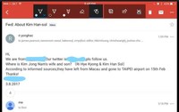 북한인으로 추정되는 인물이 김정남의 북한 여권 사본을 제시하며 '김정남 가족은 2월 15일 이미 타이페이로 출국했다' 고 주장해 눈길을 끌고 있다.김한솔의 유튜브 영상이 공개된 직후인 8일 오후 Ri Yong Hac 명의의 이메일이 외신기자들에게 발송되었는데, 그는 이