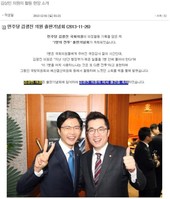 문창극 비난하는 김상민, 사진은 '백선엽 장군' 비하했던 김광진과 찍어새민련 김광진, 문창극 후보자 지명 철회 촉구위해 이순신장군 동상 앞 등 대한민국 상징하는 장소에서 동시다발적으로 1인 시위 했다고 밝혀김필재 백선엽 장군을 '민족반역자'로 폄하했던 새민련 김광진