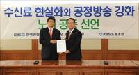 KBS 한국방송 노사가 '수신료 현실화'가 필요하다는 데 공감하고 국민적 동의를 얻기 위해 공적 책무 확대 등에 함께 노력하기로 했다.한국방송공사 김인규 사장과 'KBS 노동조합' 강동구 위원장은 14일 이 같은 내용의 '노사공동 선언문'에 전격 합의하고 이를 선언·발