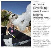 LA 타임즈에 게재된 '플로고스'애너하임 에인절스 구장에 새로운 광고기법이 등장했다고 LA 타임즈지 마케팅 섹션이 지난 7일 전했다. 새로운 광고 매체는 다름아닌 거품구름. 올 시즌 오프닝 데이, 구장에 에인절스 선수들이 나와 몸을 풀기 시작하자 갑자기 A 모양의 거