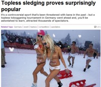 캐나다에서 동계올림픽이 열리고 있는 가운데 독일에선 '누드 썰매 대회'가 개최돼 참가자들의 뜨거운 호응을 얻었다는 소식이다.무료 일간지 메트로는 22일자 보도를 통해 "독일의 브라운라게(Braunlage)에서 제2회 국제 누드 썰매 대회가 열렸다"고 밝혔다.메트로에 따