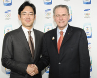 올림픽 무선통신분야 공식 후원사인 삼성전자 홍보관에 16일(현지시간) 국제올림픽위원회(IOC) 자크 로게 위원장이 방문, 삼성 홍보관을 둘러본 후 삼성전자 이재용 부사장으로부터 삼성전자 옴니아 등 삼성전자 제품을 소개받고 약 30분간 환담을 나눴다.삼성전자 홍보관을 방