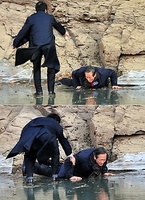 "대표직 승계할 뻔했다"한나라당 정몽준 대표가 5일 울산시 울주군의 국보 '반구대 암각화'를 보기 위해 강을 건너다 얼음이 깨져 물에 빠지는 아찔한 경험을 했다.정 대표는 이날 오후 1시 30분께 울산시 관계자로부터 반구대 암각화에 대한 설명을 듣고, 울산시당위원장인