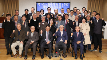 신언 국가정보연구회 회장, 이병호 전 국가정보원장, 진창수 세종연구소 수석연구위원, 장석광 국가정보연구회 사무총장을 비롯한 참석자들이 27일 오후 서울 종로구 세종연구소에서 열린 국가정보연구회 창립 5주년 기념식에서 기념촬영을 하고 있다.