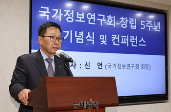 신언 국가정보연구회 회장이 27일 오후 서울 종로구 세종연구소에서 열린 국가정보연구회 창립 5주년 기념식에서 개회사를 하고 있다.