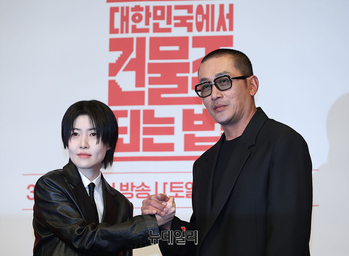 배우 하정우, 심은경이 9일 오후 서울 구로구 더링크호텔 서울에서 열린 tvN 드라마 '대한민국에서 건물주 되는 법(연출 임필성, 극본 오한기)' 제작보고회에서 포즈를 취하고 있다. '대한민국에서 건물주 되는 법'은 건물주가 되고 건물을 지키기 위해 처절하게