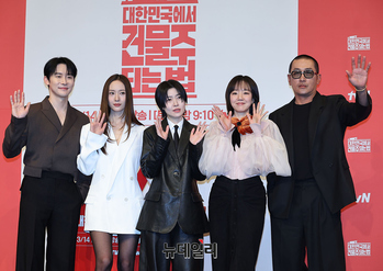 주연 배우들이 9일 오후 서울 구로구 더링크호텔 서울에서 열린 tvN 드라마 '대한민국에서 건물주 되는 법(연출 임필성, 극본 오한기)' 제작보고회에서 포즈를 취하고 있다. '대한민국에서 건물주 되는 법'은 건물주가 되고 건물을 지키기 위해 처절하게 발악하는