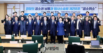 정청래 더불어민주당 대표가 9일 오전 국회 의원회관에서 열린 조작기소 진상규명 및 공소취소를 위한 국정조사 추진 정책토론회에서 박성준 국조추진위 부위원장 등 참석자들과 기념촬영하고 있다.