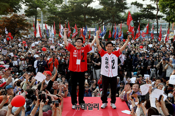 김문수 국민의힘 대선후보가 26일 오후 서울 도봉구 방학사거리에서 열린 집중유세에서 한동훈 전 대표와 손을 잡고 지지자들에게 화답하고 있다. (사진=김문수 캠프)