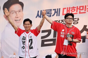 김문수 국민의힘 대통령 후보와 한동훈 전 국민의힘 대표가 마침내 손을 맞잡았다. 그간 중앙선거대책위원회 합류에 선을 그으며 독자 유세를 펼쳤지만, 공식 선거운동 시작 보름 만에 한 전 대표가 김 후보의 유세 현장에 모습을 드러낸 것이다.한 전 대표로서는 전날 송파 석촌