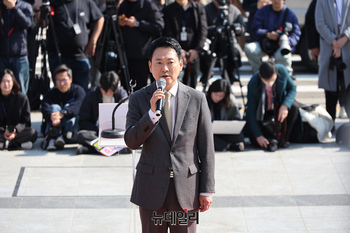 이철우 경북도지사가 4일 국회 본관 앞 계단에서 열린 '대구경북행정통합특별법 통과 촉구 대구경북 결의대회'에 참석해 발언을 하고 있다.