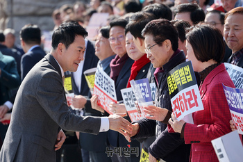장동혁 국민의힘 대표가 4일 국회 본관 앞 계단에서 열린 '대구경북행정통합특별법 통과 촉구 대구경북 결의대회'에 참석해 이철우 경북도지사와 악수를 나누고 있다.