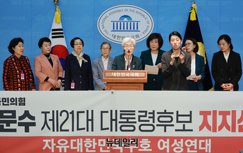 김길자 자유대한민국수호 여성연대 총장 및 회원들이 23일 오전 국회 소통관에서 기자회견을 갖고 김문수 국민의힘 대선후보 지지선언을 하고 있다. 이날 참석자들은 "무상복지를 앞세운 사회주의로의 체제 전환 위기에 직면해 있다"며 "이번 대선이 자유민주주의와 시장경