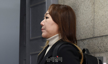 명태균씨가 실소유한 미래한국연구소의 부소장이었던 강혜경 씨가 4일 오전 서울 서초구 서울중앙지방법원에서 열린 정치자금법 위반 첫 공판에 증인출석하고 있다.