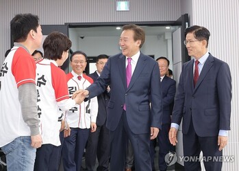 손학규 전 바른미래당 대표가 22일 오전 서울 여의도 국민의힘 중앙당사에서 김문수 대선후보 지지를 선언하기 전 박대출 총괄지원본부장과 포옹인사를 하고 있다.