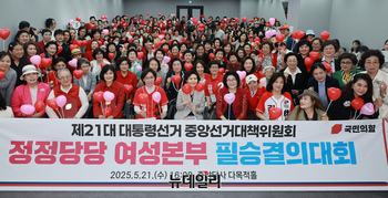 김문수 국민의힘 대선 후보의 배우자 설난영 씨가 본격적으로 선거전에 등판하면서 여성 유권자 표심 공략에 나섰다. 21일 오후 서울 여의도 국민의힘 중앙당사에서 열린 '정정당당 여성본부 필승결의대회'에 참석한 설 씨는 400여 명이 넘는 여성 당원들과 함께 대선 승리를