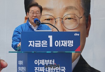 이재명 더불어민주당 대선후보가 19일 오후 서울 용산역 광장에서 열린 집중유세에서 지지호소를 하고 있다.