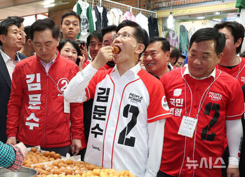 김문수 국민의힘 대선 후보가 제21대 대통령 선거 공식 선거운동 둘째 날인 13일 울산에서 지지자들과 만나 인사를 나누고 지지를 호소했다.김 후보는 13일 울산 중구 성남동 뉴코아아울렛 앞에서 유세 무대에 올랐다. 먼저 대기하고 있던 수백 명의 지지자들은 김 후보의 등
