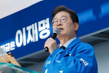 이재명 더불어민주당 대선 후보가 13일 오후 대구 중구 대구백화점 앞에서 열린 유세현장에서 지지를 호소하고 있다. (대구=서성진 기자)