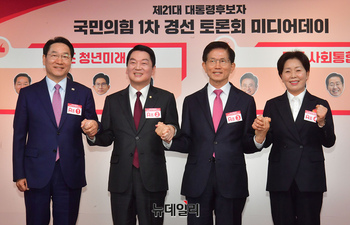 제21대 대통령후보자 국민의힘 1차 경선 토론회 미디어데이가 17일 오전 서울 영등포구 여의도 중앙당사에서 열린 가운데 B조 이철우(왼쪽부터) 경북도지사, 나경원 의원, 홍준표 전 대구시장, 한동훈 전 대표가 기념촬영을 하고 있다.