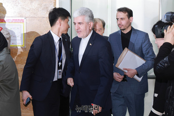 사이드 쿠제치 주한 이란 대사가 25일 오전 국회에서 김석기 외교통일위원장 및 여야 간사들과 면담을 위해 이동하고 있다.