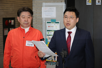 이상규 전 국민의힘 성북을 당협위원장과 이승현 한국무역협회 부회장이 25일 서울 여의도 당사에서 서울시장 후보 컷오프 관련 입장을 밝히고 있다.