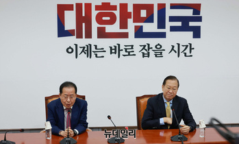 홍준표 전 대구시장이 14일 오전 국회에서 권영세 국민의힘 비상대책위원장을 만나 인사말을 하고 있다.