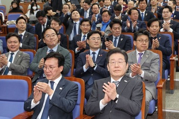 [포토] 박찬대 원내대표 어깨 두드리는 이재명 대표