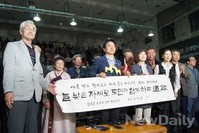 [포토]당선 선물로 배낭과 운동화 받은 박원순 후보