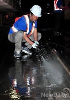 [포토]물 뿌리며 청소하는 정몽준 서울시장후보