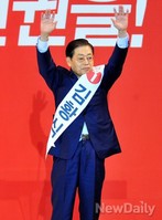 새누리당 서울시장 경선 후보가 12일 오후 서울 올림픽체조경기장에서 열린 [6.4 전국동시지방선거] 새누리당 서울시장 후보자 선출대회에서 당원들에게 손을 흔들고 있다. …