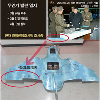 최근 잇따라 추락한 무인기와 같은 모양의 무인기가 김정은 국방위원회 제1위원장 현지 시찰 당시 북한조선중앙TV에 방영됐던 것으로 확인되면서 결정적 증거로 떠올랐다.이 사진은 지난해 3월 25일 김 위원장이 1501 부대를 방문했던 것으로, 사진 좌측 하단에 이번 파주에