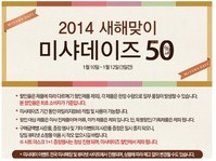화장품 브랜드가 새해를 맞이해 최대 50% 할인 행사를 진행한다.10일 미샤는 공식 홈페이지를 통해 오는 12일까지 3일간 '2014 새해맞이 미샤데이' 할인 행사를 실시한다고 밝혔다.미샤는 할인 기간 동안 미샤 전 제품을 최대 50%까지 할인 된 가격에 판매한다. 단