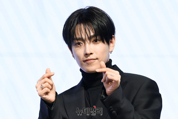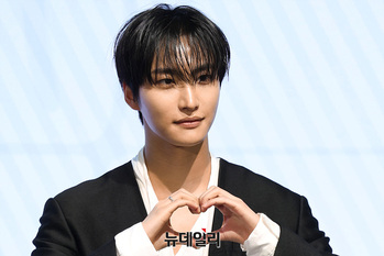 그룹 에이티즈(ATEEZ) 민기가 5일 오후 서울 여의도 페어몬트 앰배서더 서울에서 열린 미니 13집 앨범 'GOLDEN HOUR : Part.4' 기자간담회에서 포즈를 취하고 있다.이번 앨범은 타이틀곡 '아드레날른(Adrenaline)'을 포함해 다섯 곡을 담았다.