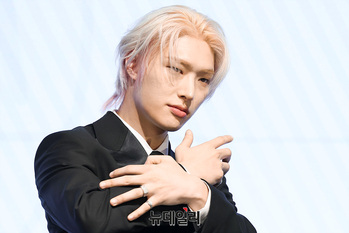 그룹 에이티즈(ATEEZ) 성화가 5일 오후 서울 여의도 페어몬트 앰배서더 서울에서 열린 미니 13집 앨범 'GOLDEN HOUR : Part.4' 기자간담회에서 포즈를 취하고 있다.이번 앨범은 타이틀곡 '아드레날른(Adrenaline)'을 포함해 다섯 곡을 담았다.