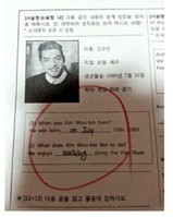 배우 김우빈이 중학교영어시험 문제에 등장했다. 최근 온라인 커뮤니티 게시판에는 [중학교 시험문제]라는 제목으로 김우빈의 사진이 담긴 영어시험 문제지가 올라왔다. 공개된 사진에는 한 학교 영어 시험지로 김우빈의 간단한 프로필이 담겨 있다. 김우빈의 한글 프로필을 보고 생