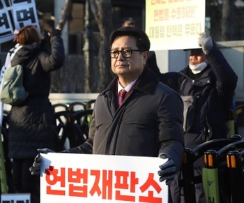 김장겸 국민의힘 의원이 25일 헌법재판소 앞에서 헌법재판소의 공정한 심판을 촉구하는 1인 시위를 진행했다. 국민의힘 의원들은 지난 17일부터 헌법재판소 앞에서 릴레이 1인 시위를 이어가고 있다.김장겸 의원은 "헌재가 윤석열 대통령의 증인신문을 일방적으로 막고, 신문 시