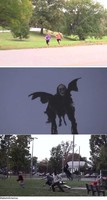 조깅하다 저승사자를 만났다? 최근 한 온라인 커뮤니티 게시판에는 [조깅하다 만난 저승사자]라는 제목으로 한 장의 사진이 올라왔다. 공개된 사진에는 검은 망토에 해골 얼굴, 박쥐의 날개를 가진 저승사자가 곳곳에 출현해 많은 사람들을 놀라게 하고 있다. 이 저승사자는 조깅
