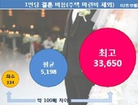 주택 마련을 빼고도 1인당 결혼비용이 평균 5천만원을 넘어섰다. 한국소비자원이 결혼 당사자와 혼주 1천 명을 상대로 설문 조사를 벌인 결과 1인당 평균 결혼 비용은 5천2백만원으로 최소 334만원에서 최대 3억3천650만원에 달하는 것으로 나타났다. 남성은 경우 결혼